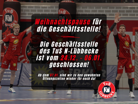 Die Geschäftsstelle des TuS N-Lübbecke bleibt in der Zeit von Mittwoch, 24. Dezember, bis einschließlich Dienstag, 6. Januar, vorübergehend geschlossen. In diesem Zeitraum ist die Geschäftsstelle weder persönlich noch telefonisch erreichbar. Am 23.12. sind wir noch bis 15:00 Uhr vor Ort.
