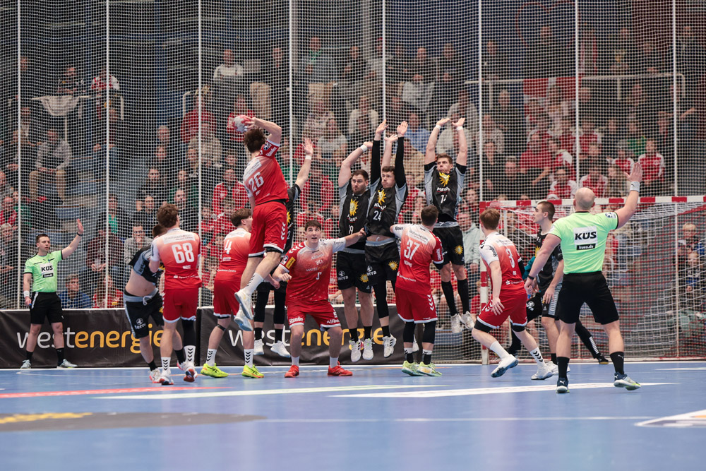 6:2 Treffer war die nächste Zwischenbilanz der Essener Mannschaft bis zur 42. Minute, Spielstand 23:16. Fehlpässe, Fehlwürfe und weitere unnötige Ballverluste säumten den Weg des Lübbecker Spiels. Es schien kein guter Abend mehr zu werden für die Ostwestfalen. Nach dem 27:21 (47.) wendete sich das Blatt aber nach und nach, wozu auch 2 Paraden von Fredrik Genz mit beitrugen. Der 8:2-Lauf der Dominikovic-Schützlinge brachte den ersten Ausgleich seit dem 6:6 (13.), als nach gewonnener 1:1-Situation Kasper Haugen Furu zum 29:29 traf. Nun waren die Nerven der Zuschauer auf beiden Seiten extrem angespannt, neutrale Beobachter erfreuten sich dagegen an der Spannung.
